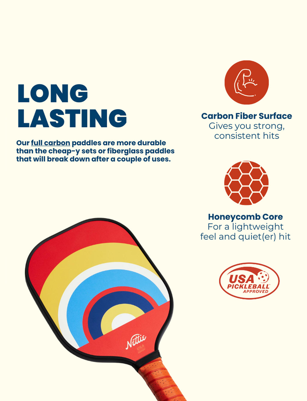 Our favorite brand of pickleball paddles is none other than Nettie. We met during COVID and we love their products! The Nettie Classic Paddles are USAPA-approved. Made with premium materials so you can dink, volley, and slam your way to wins. And designed with a signature retro style that is made to look how pickleball feels – joyful!